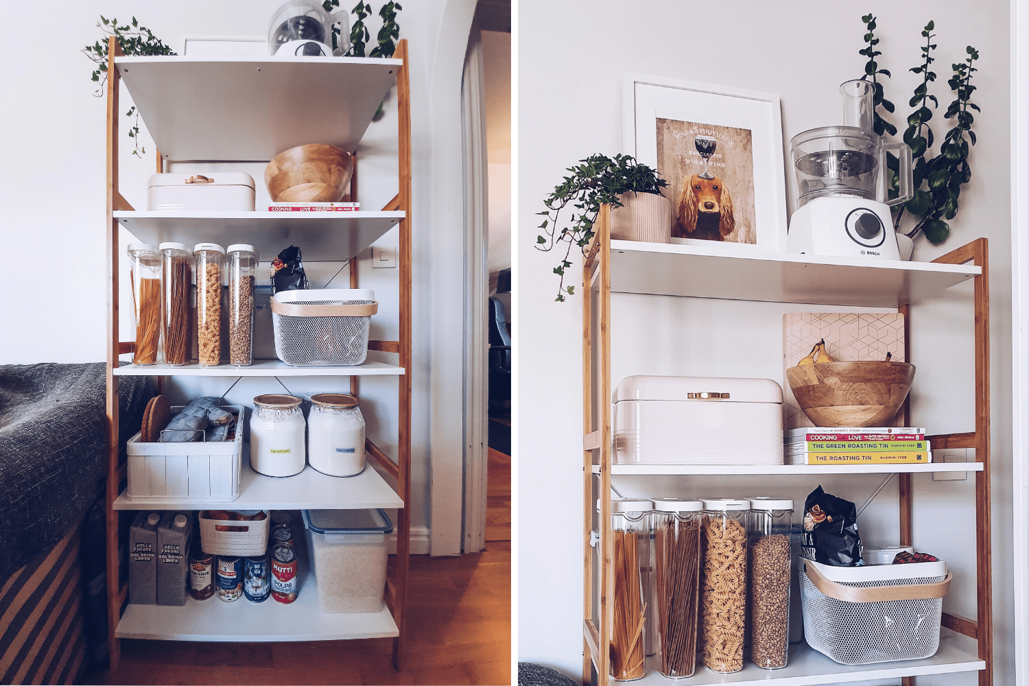 As the room was already so full, adding extra storage space was a bit tricky, and it narrowed down the choices significantly when it comes to choosing furniture. In the end, I settled for an open shelf. The large shelf surface allows me to put some kitchen appliances and big storage boxes, with enough space for some decor pieces as well.