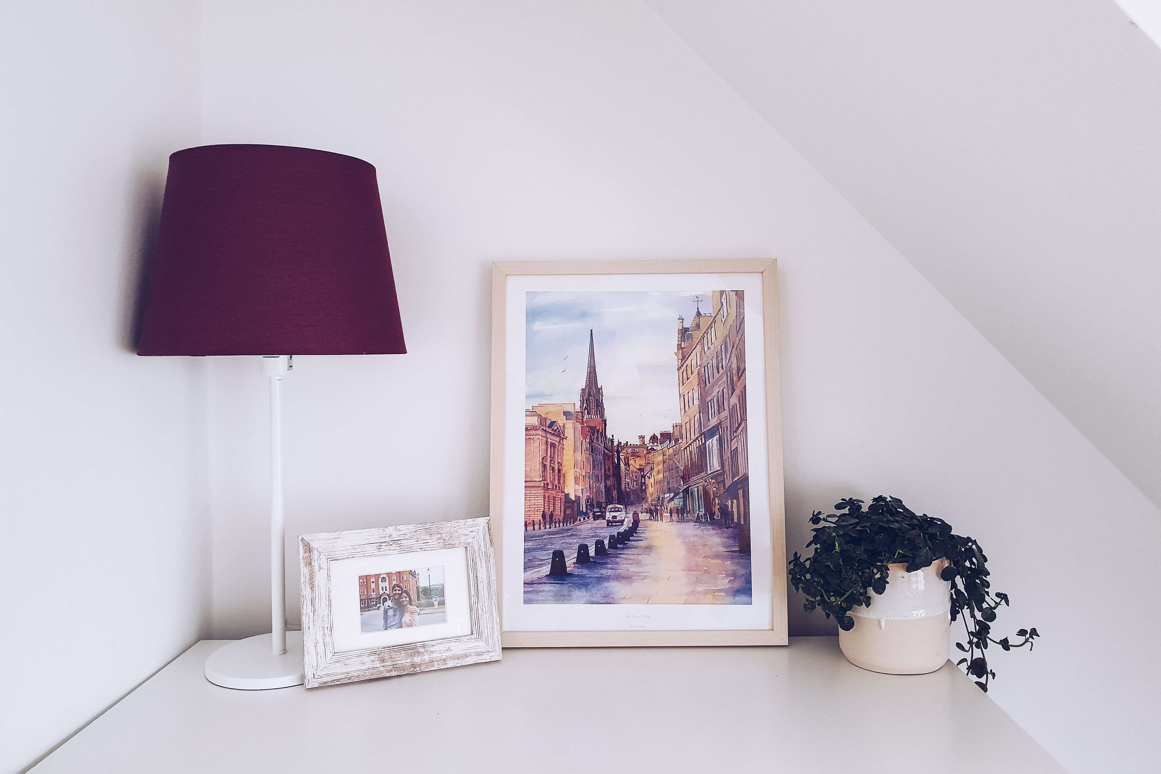This corner in our bedroom used to have a TV stand and a screen before. I wasn’t keen on both in the bedroom, as I wanted the room to feel more ‘zen’. So we took out the TV stand and screen (we rarely used it anyway), moved the dresser to this corner, and added a photo, a plant, and Edinburgh artwork which I bought during my trip there years ago. I’ve visited the city a few times since, and there’s just something about it that makes me feel warm and so, so happy. Looking at this painting of one of my favorite cities in the world always brings me back to those wonderful times in Edinburgh.