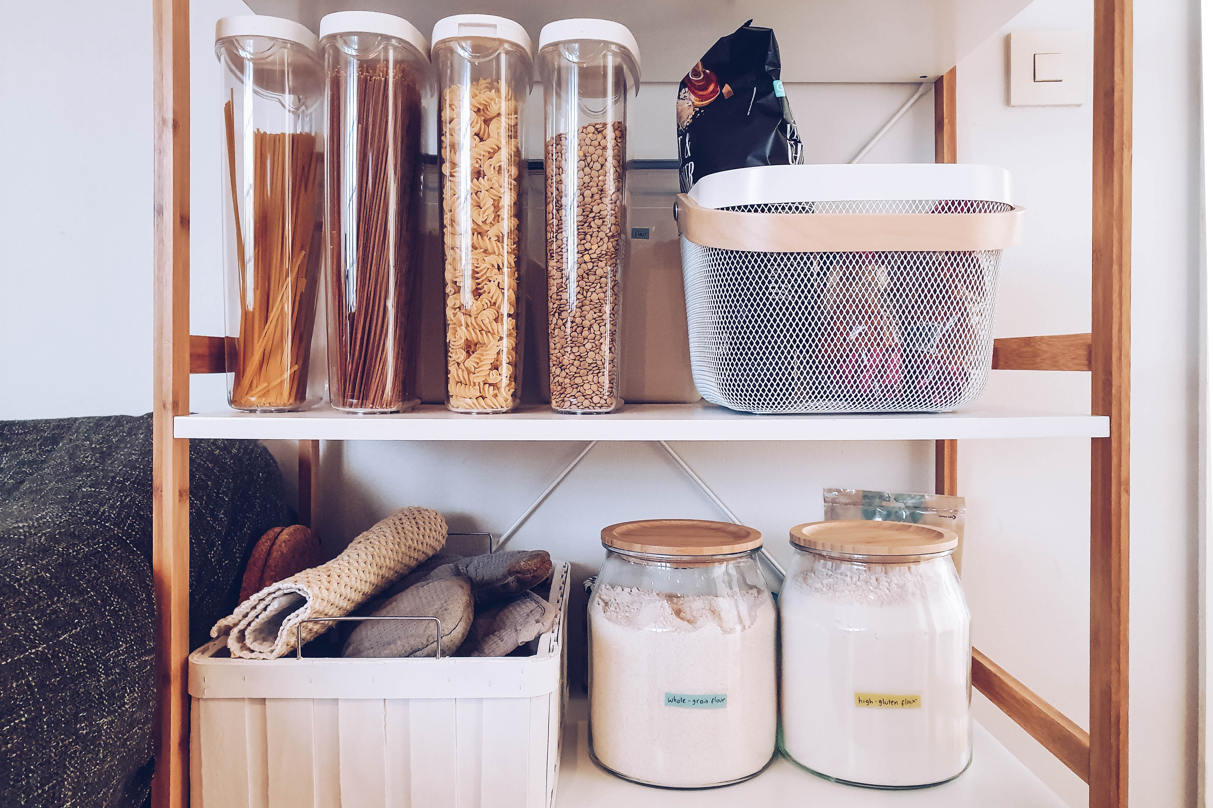 Now, the storage pieces. I knew I wanted transparent containers for our pantry staples — it’s important that I could see in a glance the ingredients we have and where they are, while keeping the whole thing look nice and pleasing. I also knew I wanted big containers for things we cook regularly (like rice, pasta, and lentils), so I wouldn’t have to keep re-filling the container every time we use it. To mix things up, I added in some wonderful baskets for little things that would just look scattered when they’re put on the shelf on their own.
